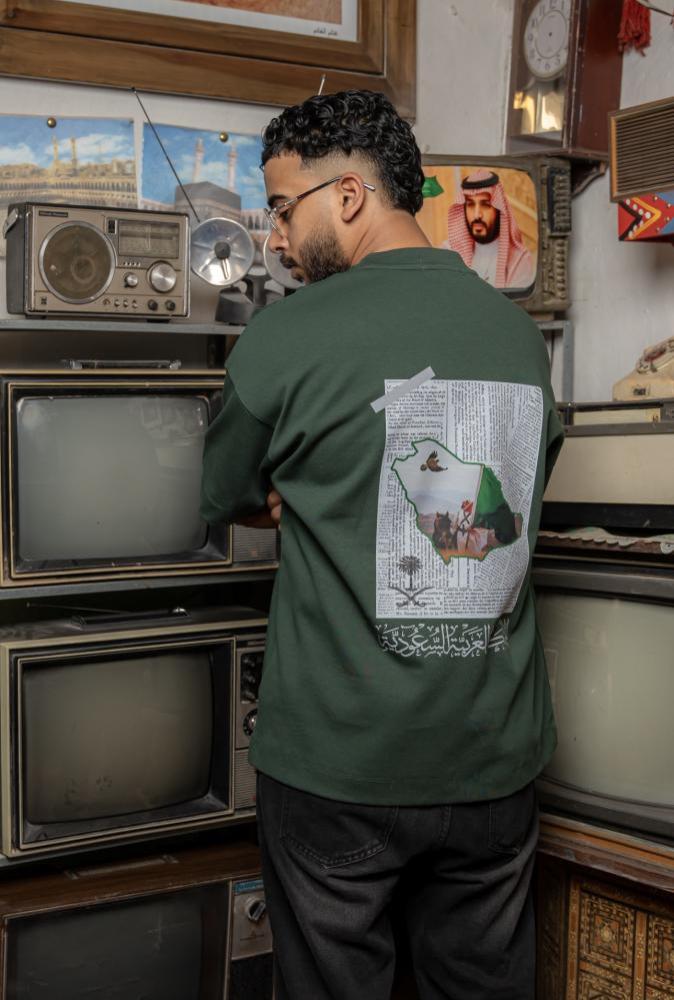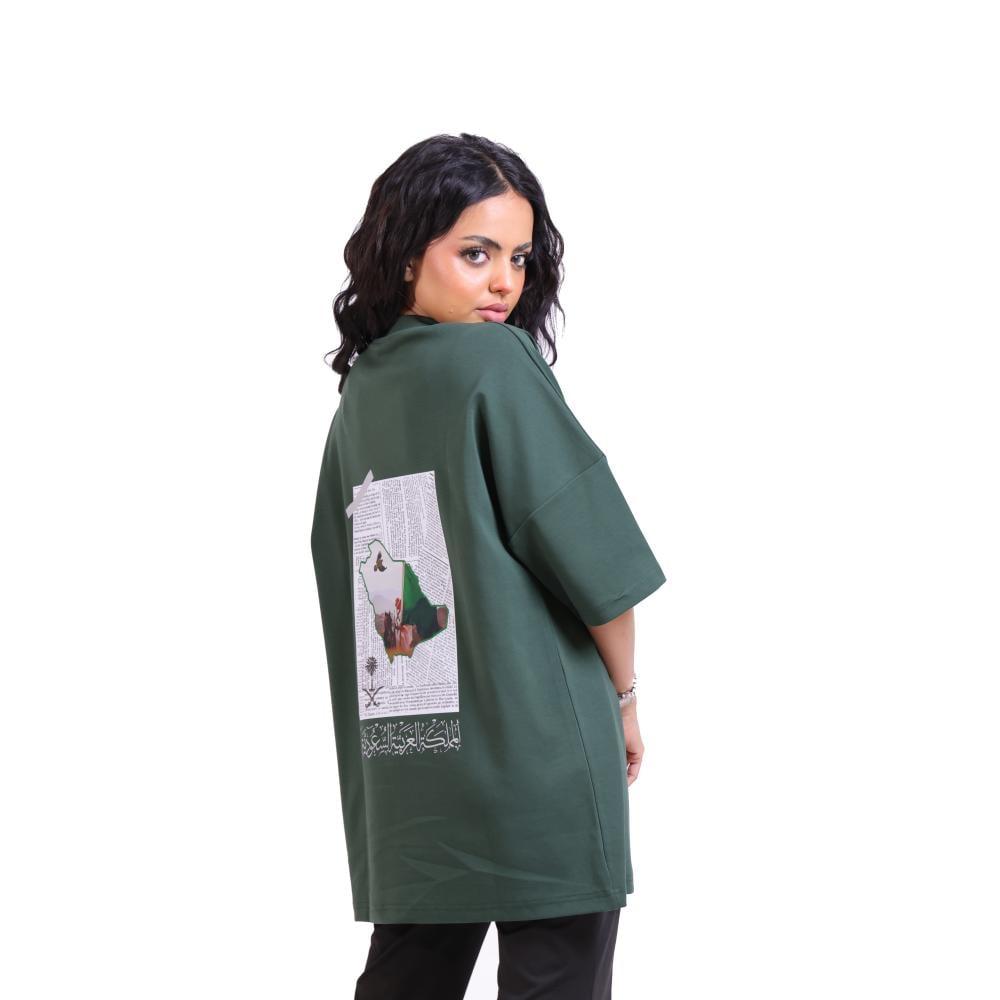 تيشيرت اليوم الوطني السعودياللون الأخضر الداكنمناسب للجنسين - اوفر سايزمتوفر بعدة مقاسات طباعة من الامام والخلف